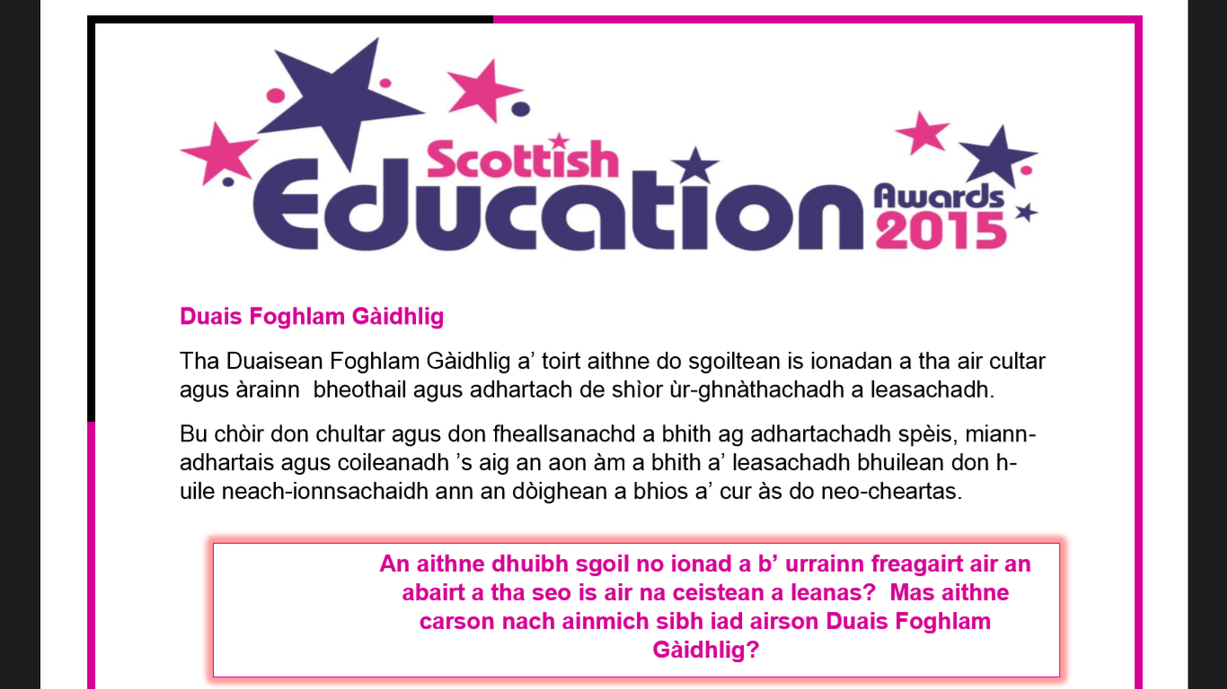 “Tha Duaisean Foghlam Gàidhlig a’ toirt aithne do sgoiltean is ionadan a tha air cultar agus àrainn bheothail agus adhartach de shìor ùr-ghnàthachadh a leasachadh.