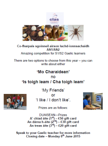 Comann Luchd-Teagaisg Àrd-Sgoiltean (CLAS), the professional association for Gaelic secondary teachers, is running Gaelic writing competitions for Gaelic Medium and Gaelic Learners in S1 & 2. Gaelic Learners are being asked to write about their friends or their likes & dislikes. Students in Gaelic Medium are being asked to write about ‘A concert’ or ‘Life on another planet’. Each school can submit the 10 best pieces from each of their classes before Monday 8 June. Further details are available here: www.clas123.wordpress.com/co-fharpaisean