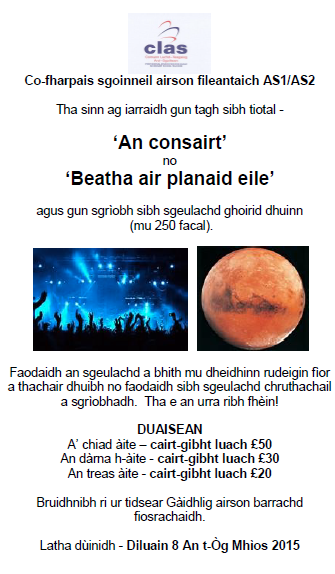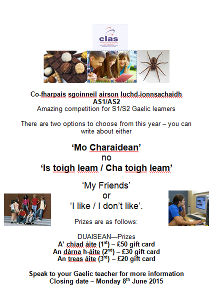 Comann Luchd-Teagaisg Àrd-Sgoiltean (CLAS), the professional association for Gaelic secondary teachers, is running Gaelic writing competitions for Gaelic Medium and Gaelic Learners in S1 & 2. Gaelic Learners are being asked to write about their friends or their likes & dislikes. Students in Gaelic Medium are being asked to write about ‘A concert’ or ‘Life on another planet’. Each school can submit the 10 best pieces from each of their classes before Monday 8 June. Further details are available here: www.clas123.wordpress.com/co-fharpaisean